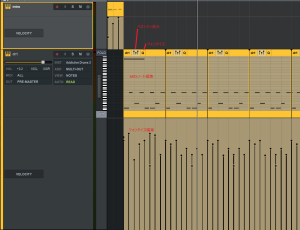 ピアノロールは専用の画面はなくトラック中に表示されます。これがなんともやりづらい。